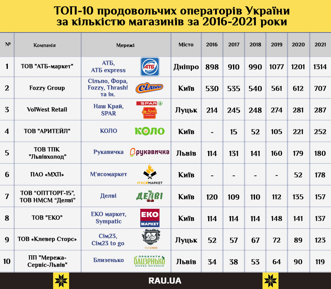 Серед нинішніх лідерів за кількістю торгових точок залишилося не більше ніж дві третини тих, хто фігурував у рейтингу ще п’ять років тому. Частину купили конкуренти, частина закрилася, когось обігнали інші гравці. Незмінна поки що лише перша трійка: АТБ, Fozzy Group і VolWest Retail (Наш Край, SPAR).