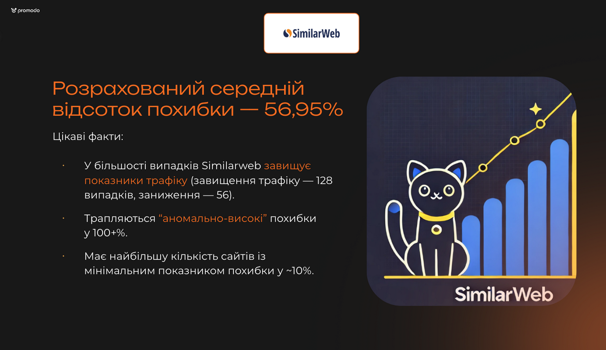 Найбільша перевага сервісу на зараз — це оновлення, яке відбулося у липні 2024-го. Вони покращили свою систему трекінгу, після чого суттєво збільшилася кількість сайтів, де показники різняться з фактичними з мінімальним відсотком похибки. На думку фахівців Promodo, Similarweb має найбільший потенціал з подальшого розвитку та покращення.