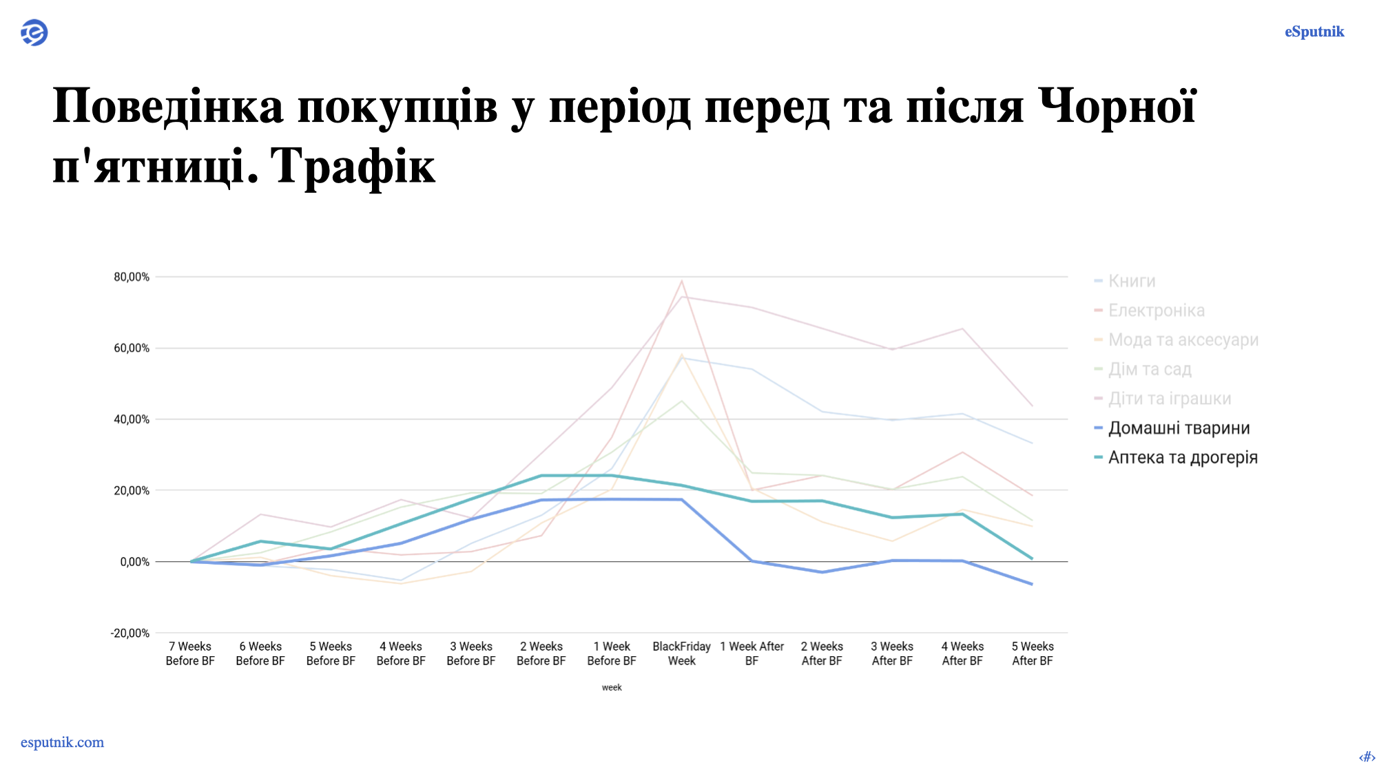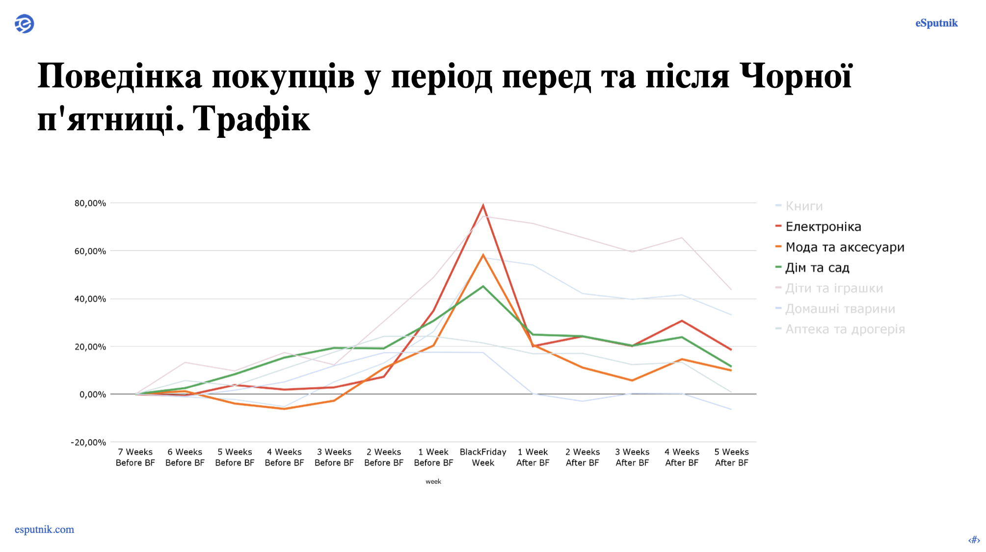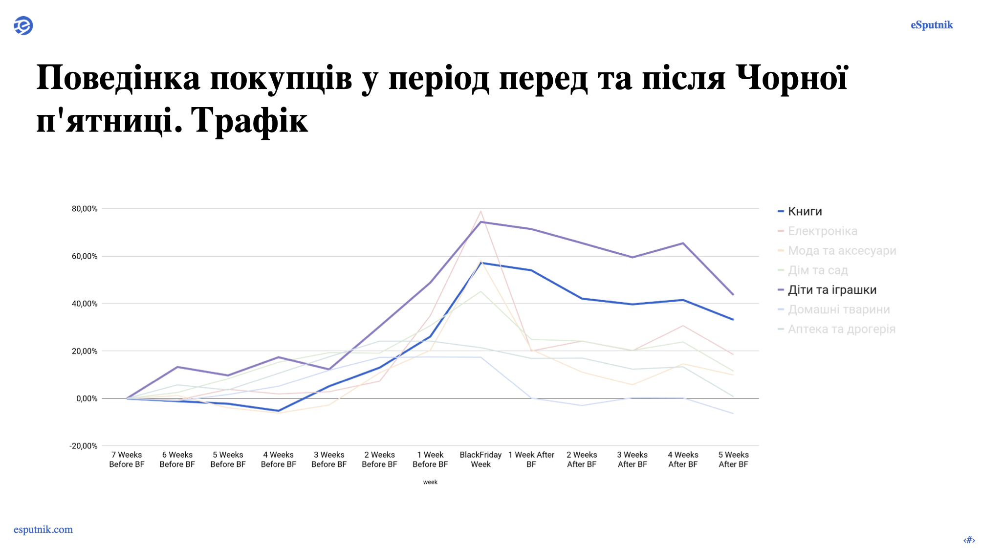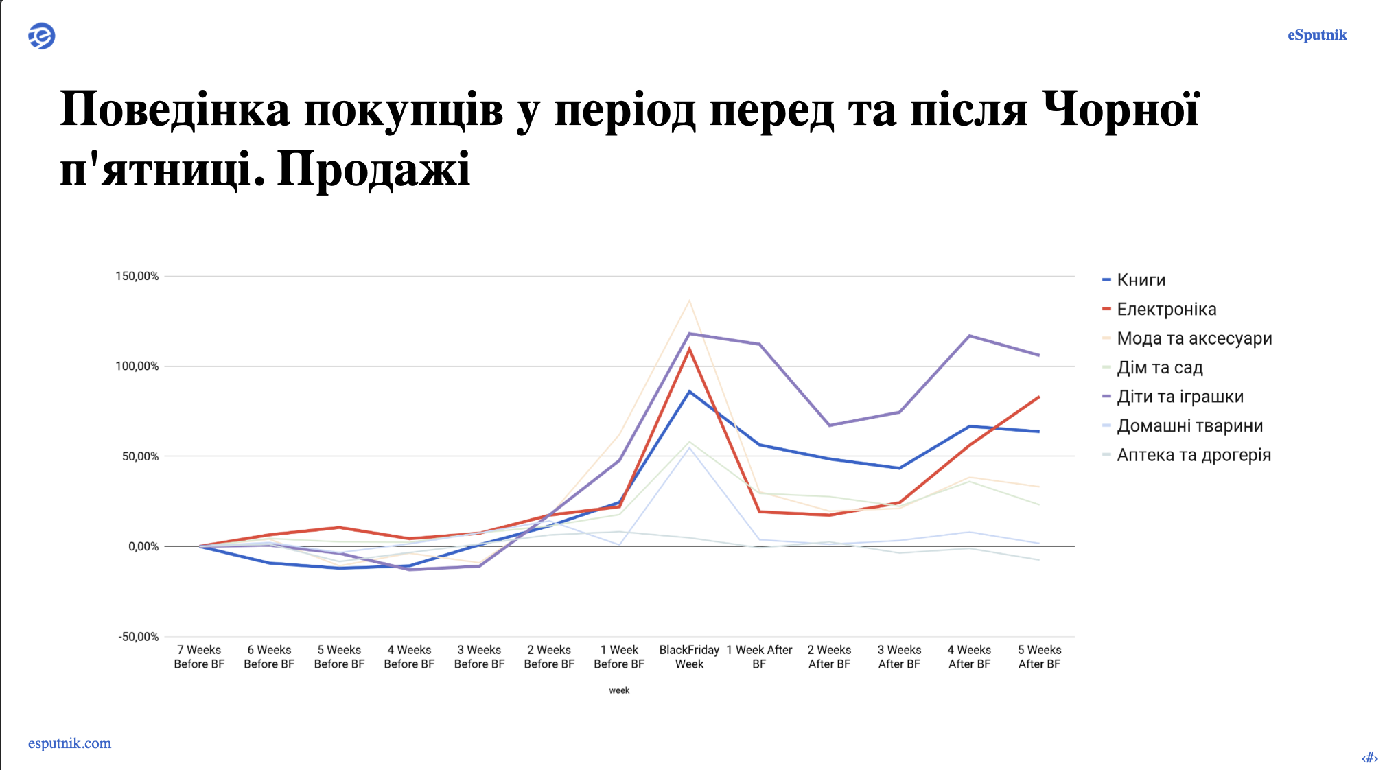 Окремо варто згадати такі категорії як “Дитячі товари та іграшки” та “Книги”. Ці сегменти показують дуже високі результати продажів у період Чорної п’ятниці, які можуть дорівнювати рівню продажів за весь попередній рік. Після піку попит на ці товари залишається високим аж до Нового року. Пояснюється це тим, що багато людей купують подарунки для дітей та рідних саме в цей період.