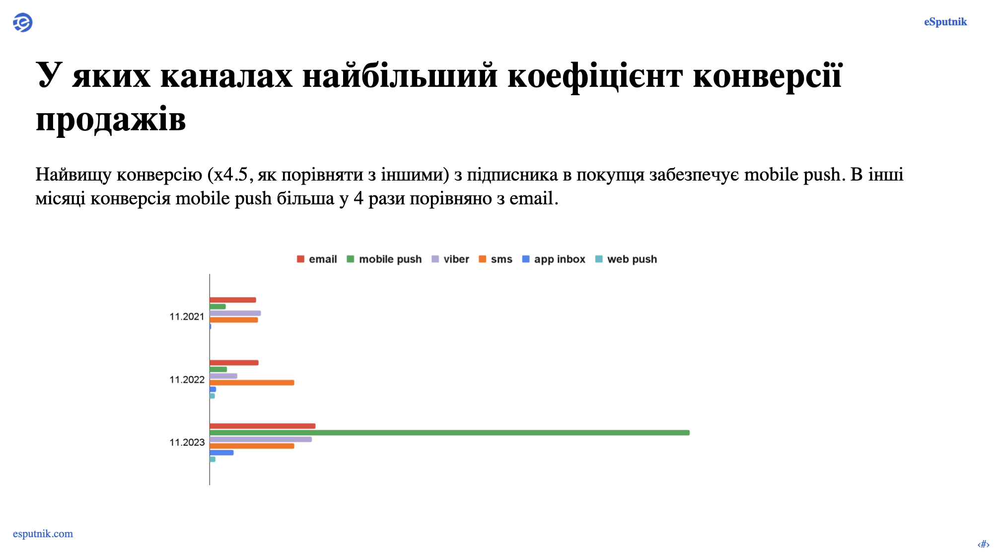 Цікаво проаналізувати, як компанії комунікують свої акційні пропозиції під час Чорної п’ятниці. Так, у цей період значно зростає кількість повідомлень у таких каналах, як sms, Viber та веб-віджети. Ритейлери особливо активно використовують тригерні повідомлення та масові розсилки, особливо в день Чорної п’ятниці. Це ефективний спосіб залучити аудиторію, яка давно не здійснювала покупки.