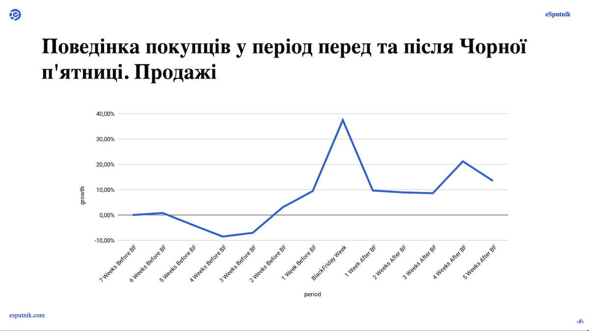 Період Чорною п’ятниці, а також до та після має деякі цікаві закономірності: трафік на сайтах ритейлерів значно зростає, але це не дорівнює росту продажів, оскільки покупці активно відстежують акції та знижки, але не купують. Тому перед Чорною п’ятницею також через відкладений попит спостерігається певний спад продажів. Пік продажів припадає саме на тиждень Чорної п’ятниці, після чого спостерігається поступове зниження. Однак, спад продажів після піку відбувається більш різко, ніж спад трафіку.