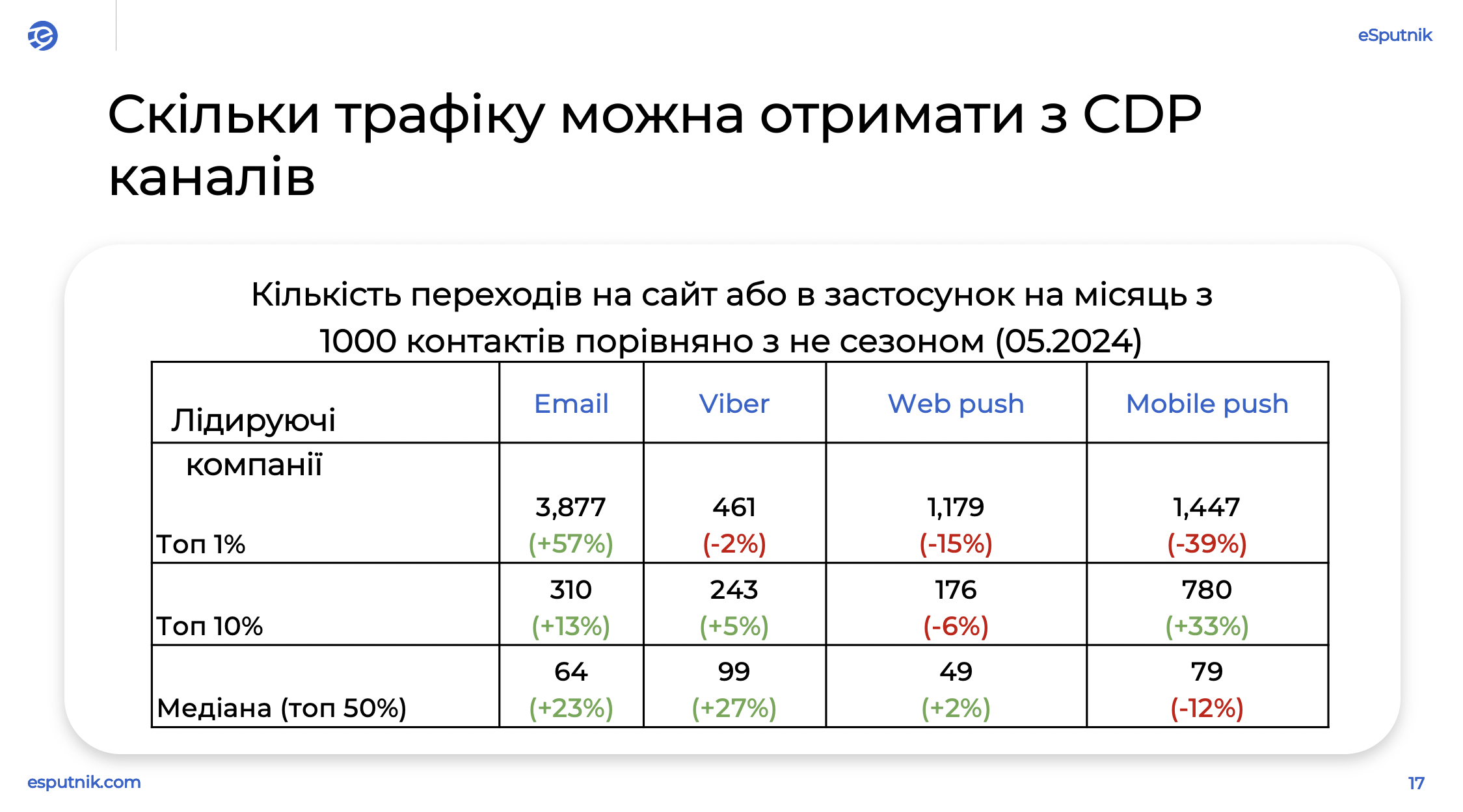 Цікаво поглянути не те, як найкращі компанії на ринку генерують трафік. Так, топ компаній (умовно сім компаній з усієї бази eSputnik) з 1000 контактів у середньому генерує 4 переходи на сайт за місяць. Це свідчить про дуже високу ефективність їхніх маркетингових кампаній. Топ-10 компаній (близько 70 компаній з усієї бази eSputnik) у Viber з 1000 контактів зазвичай отримують близько 500 переходів на сайт.