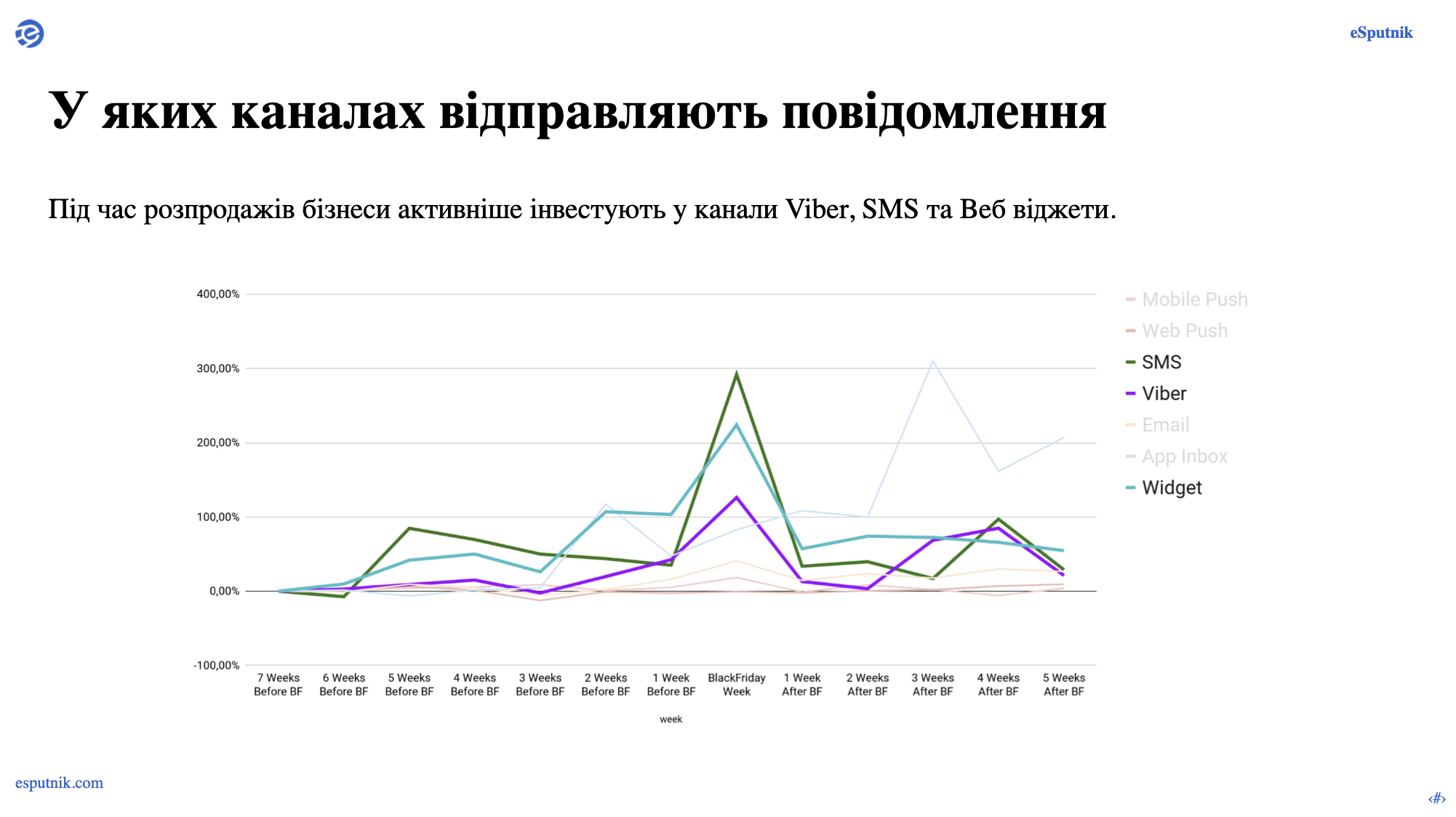 Цікаво проаналізувати, як компанії комунікують свої акційні пропозиції під час Чорної п’ятниці. Так, у цей період значно зростає кількість повідомлень у таких каналах, як sms, Viber та веб-віджети. Ритейлери особливо активно використовують тригерні повідомлення та масові розсилки, особливо в день Чорної п’ятниці. Це ефективний спосіб залучити аудиторію, яка давно не здійснювала покупки.