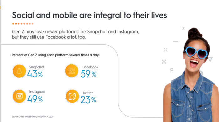 Мобільне спілкування багато в чому визначає життя пост-міленіалів у всьому світі, вони проводять більшу частину свого часу в соцмережах: 49% заходять в Instagram кілька разів на день, майже стільки ж активно (43%) користуються Snapchat. «Зети» проводять 42 години на тиждень за стримінгом відео, і в цілому їх приваблюють будь-які відеоформати.