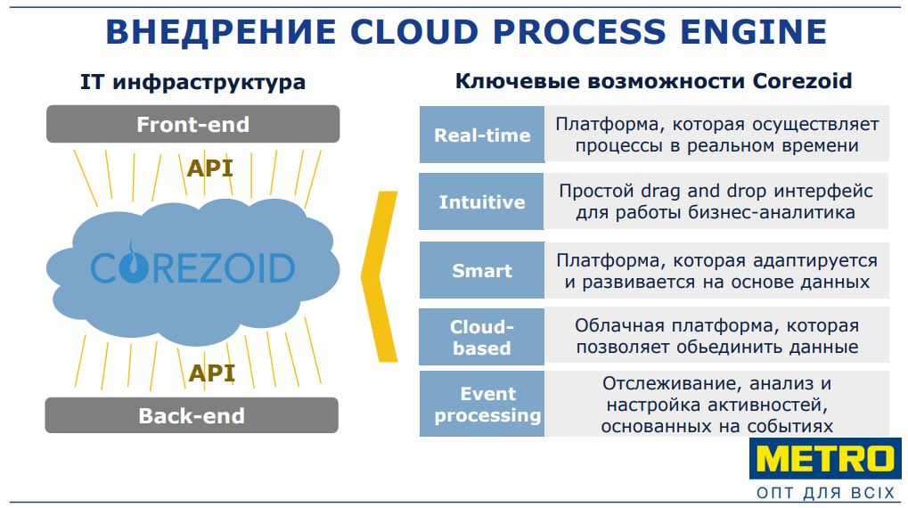 Це хмарна система, яка допомогла зв’язати корпоративні системи і канали комунікації, такі як мобільний додаток, Viber, e-mail і інші. Головна перевага полягає в тому, що система дозволяє працювати з даними в режимі реального часу, чого раніше не було. Також можна налаштовувати автоматичне тригерні повідомлення для кожного покупця. Наприклад, клієнт прийшов в магазин через три місяці своєї відсутності. І на касі після покупки йому відправляють повідомлення: «Добрий день, Оксана! Ми дуже раді, що ви до нас повернулися! Що ви думаєте про наші магазини після тривалої відсутності? »