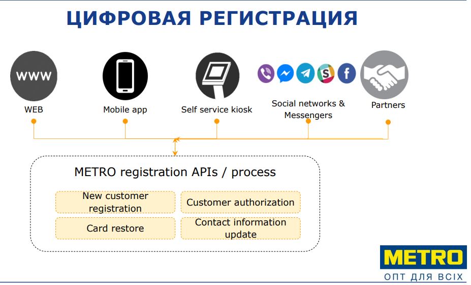 І немає необхідності в отриманні пластикової карти, реєстрації в магазині, заповненні довгих анкет – покупець вже може здійснювати покупки в торгових центрах Metro.
