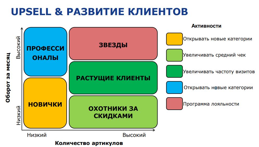 Наприклад, сегмент «новачки» – це клієнти, які купують мало товарів на невеликі суми. Їм показували інші, додаткові категорії товарів, щоб вони починали їх купувати. Відповідно продумали стратегію залучення і залучення і для інших категорій.