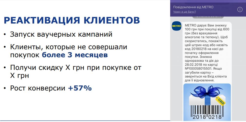 Ще одна група клієнтів – ті, які переставали ходити в мережу, і потрібно було їх утримати. Для першої кампанії, взяли споживачів, які не здійснювали покупку в ТЦ більше трьох місяців і почали слати їм ваучери зі знижкою. Наприклад: «Здійсніть покупку на 600 грн і отримаєте знижку в 100 грн».