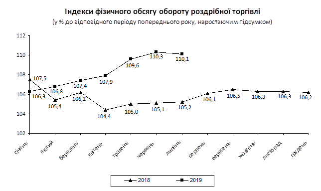 У липні поточного року проти липня 2018 року індекс фізичного обсягу обороту роздрібної торгівлі склав 110,1%.