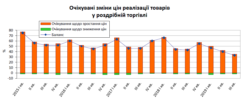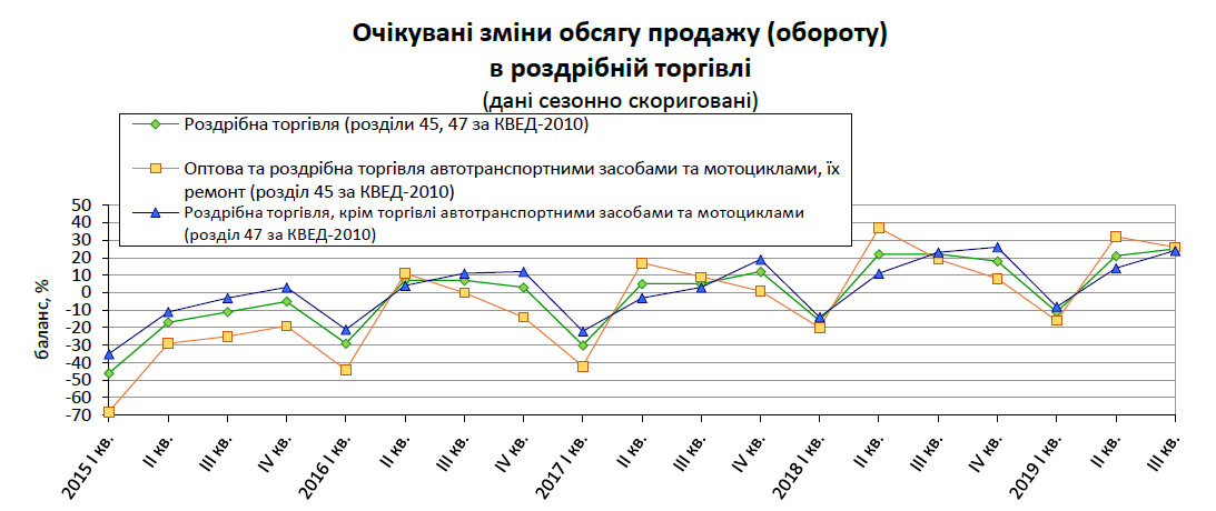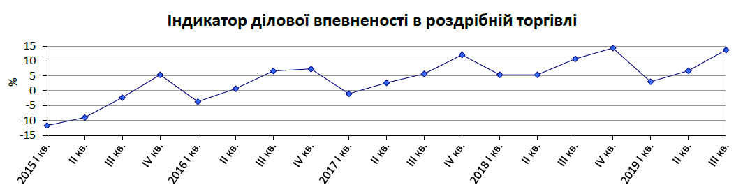 Відповідно покращилися ділові настрої та очікування власників магазинів підприємств роздрібної торгівлі щодо перспектив розвитку їх ділової активності у ІІІ кварталі 2019-го. Індикатор ділової впевненості в роздрібній торгівлі підвищився порівняно з ІІ кварталом на 7 в.п. і становить 13,7%. вища цифра була лише наприкінці минулого року 14,3%.