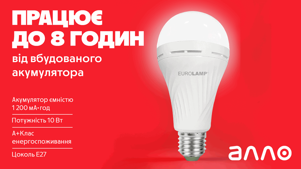 Наразі в Алло розширено асортимент акумуляторних ламп, остання новинка – лампа Eurolamp (10 Вт, 1200 мА•год, 4500 K, Е27) вартістю лише 188 грy замість 249 грy. За наявності електропостачання вона працює як звичайна лампочка і при цьому заряджає вбудований акумулятор, а за відсутності – продовжує світити як резервне освітлення. Працює автономно до 8 годин, адже акумулятор має ємність 1200 мА•год. Лампа має клас електроспоживання А+, її можна використовувати у різних приміщеннях – вона яскраво освітить кімнату в квартирі або гараж чи підвал, адже завдяки цоколю E27 сумісна з більшістю стандартних світильників. Також її можна використати як ліхтарик. На товар поширюється гарантія виробника 12 місяців.