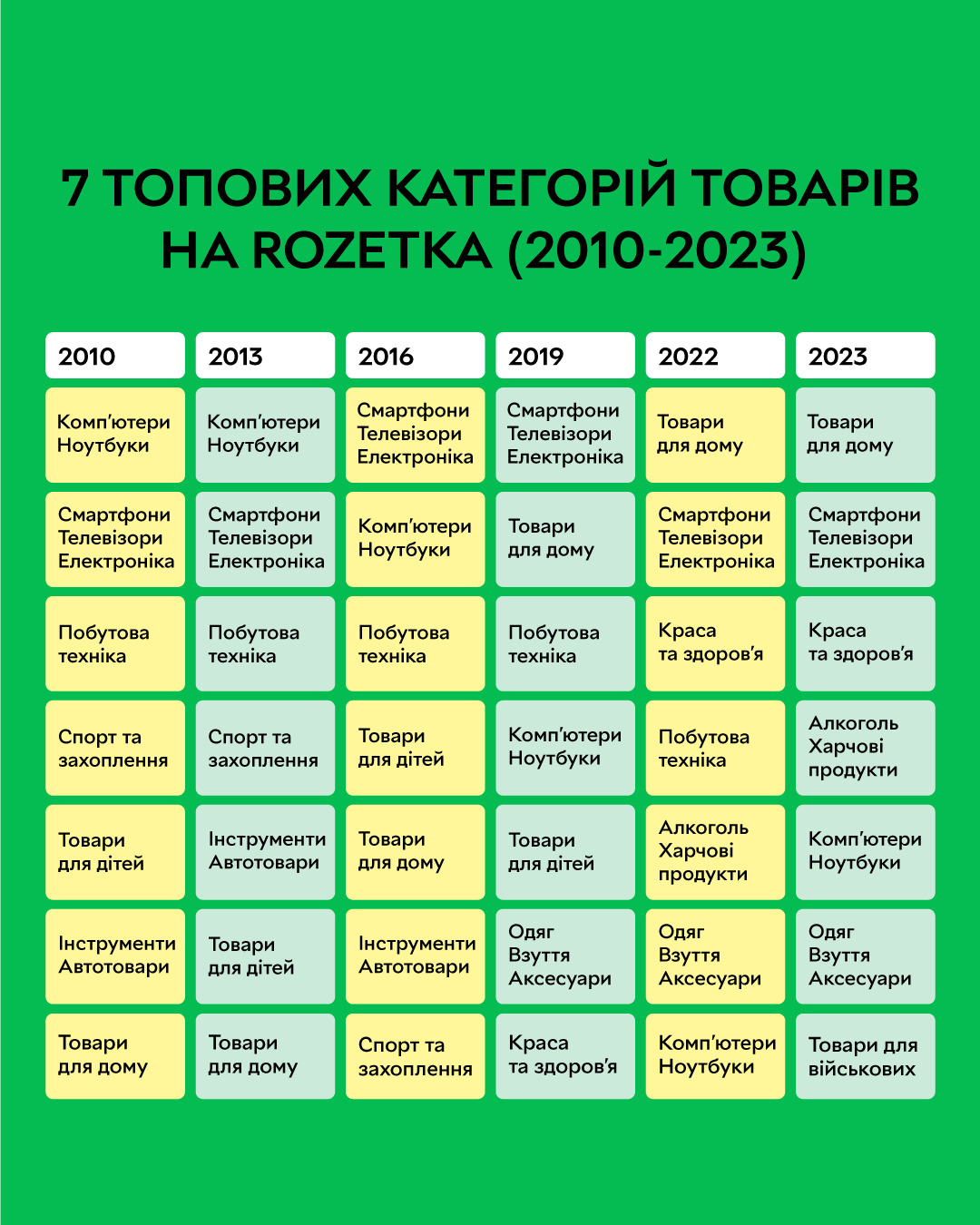 Як повідомили RAU у прес-службі компанії, до 2016 року найпопулярнішою категорією товарів на сайті Rozetka були комп’ютери та ноутбуки. Потім їх змінили смартфони, телевізори та електроніка, які раніше посідали другу позицію в рейтингу. А від початку повномасштабної війни у 2022-му найбільший попит серед усіх категорій мають товари для дому: посуд, побутова хімія, меблі, лампи та світильники, господарські товари, альтернативні джерела енергії тощо.