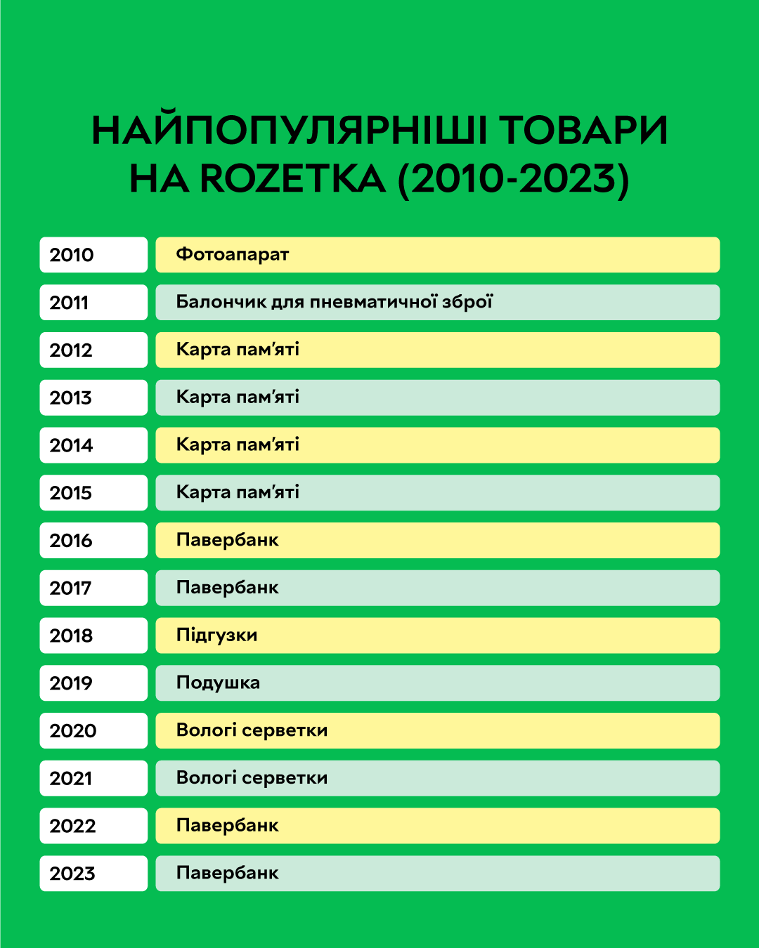 З-поміж конкретних товарів на Rozetka найбільшою популярністю найдовше користувалися карти пам’яті (2012-15 роки). У 2016-му їхнє місце посіли павербанки, які утримували позицію до 2018-го.