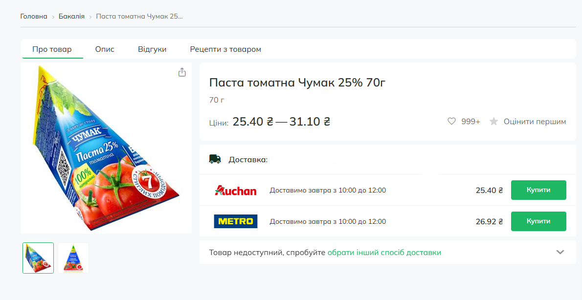 На зображенні видно, що агрегатор показує ціни в діапазоні 25,40–31,10 грн на томатну пасту. Водночас вказані два магазини, де можна купити цей товар, і верхня ціна становить уже 26,92 грн. На цій самій картці товару також позначено, що товар недоступний для замовлення, а отже актуальність ціни під сумнівом.