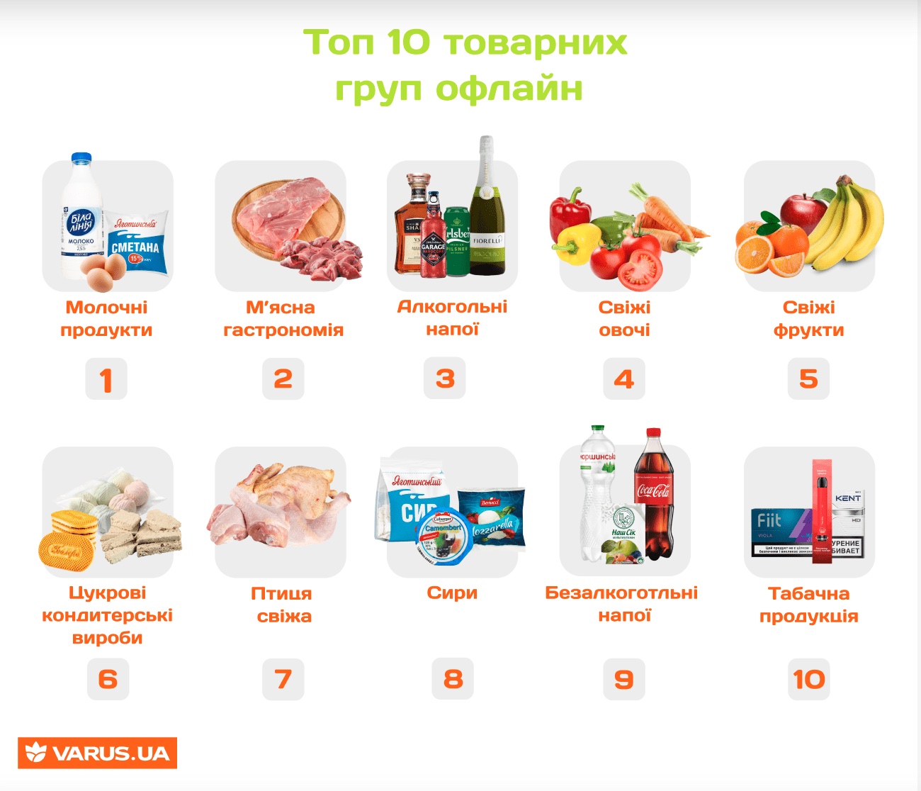 2. Популярні категорії. У магазинах Varus відвідувачі найчастіше купують молочну та м’ясну продукції, овочі й фрукти та алкогольні напої. Водночас користувачі Glovo замовляють з Varus передусім солодкі безалкогольні напої, соки та нектари, молочну продукцію, фрукти та тютюнові вироби. Якщо говорити про конкретні товари, то у Varus люди найбільше купують яйця, куряче філе та банани. Це найпопулярніші товари як в фізичних супермаркетах, так і в онлайн-замовленнях.