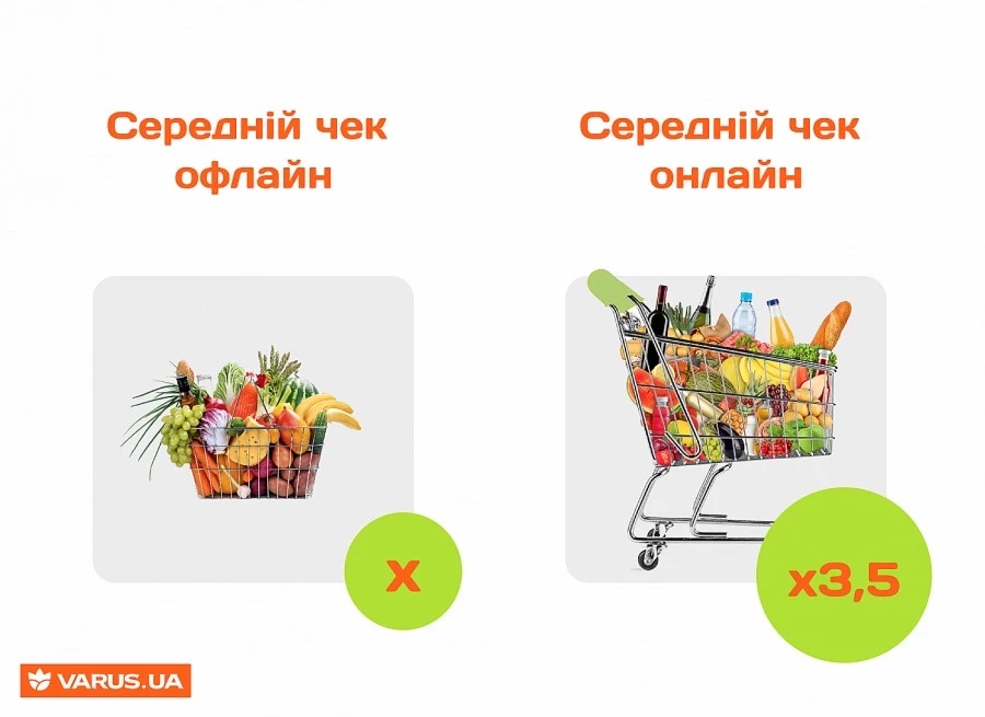 1. Кількість товарів у кошику і середній чек. Найбільша відмінність між q-commerce та покупками у фізичному магазині — це кількість товарів у кошику, яка своєю чергою впливає на середній чек. Українці купують у середньому 7 товарів за одне відвідування Varus. Середній чек у супермаркеті — 250 грн. Коли люди роблять замовлення з Varus у додатку Glovo, то купують удвічі більше — 15-16 одиниць вартістю 600 грн.