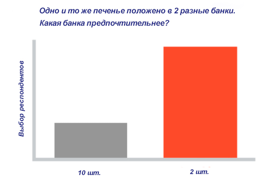 Експеримент проводився в два етапи: спочатку в кожній з банок знаходилося по 10 штук одного і того ж виду печива. Оцінки аудиторії розподілилися приблизно однаково. На другому етапі в одній з банок залишили тільки 2 штуки. На цей раз переваги аудиторії з великим выдривом були віддані банці, в якій було 2 печива.
