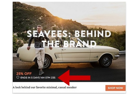 Зворотний відлік може бути використаний у вигляді дії спеціальної ціни протягом конкретного проміжку часу. Наприклад, компанія Huckberry нагадувала покупцям про те, що встановлена знижка в 25% діє строго до закінчення зворотного відліку.