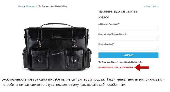 Ексклюзивність товару сама по собі є тригером продажів. Така унікальність сприймається споживачем як символ статусу, дозволяє йому відчувати себе особливим.