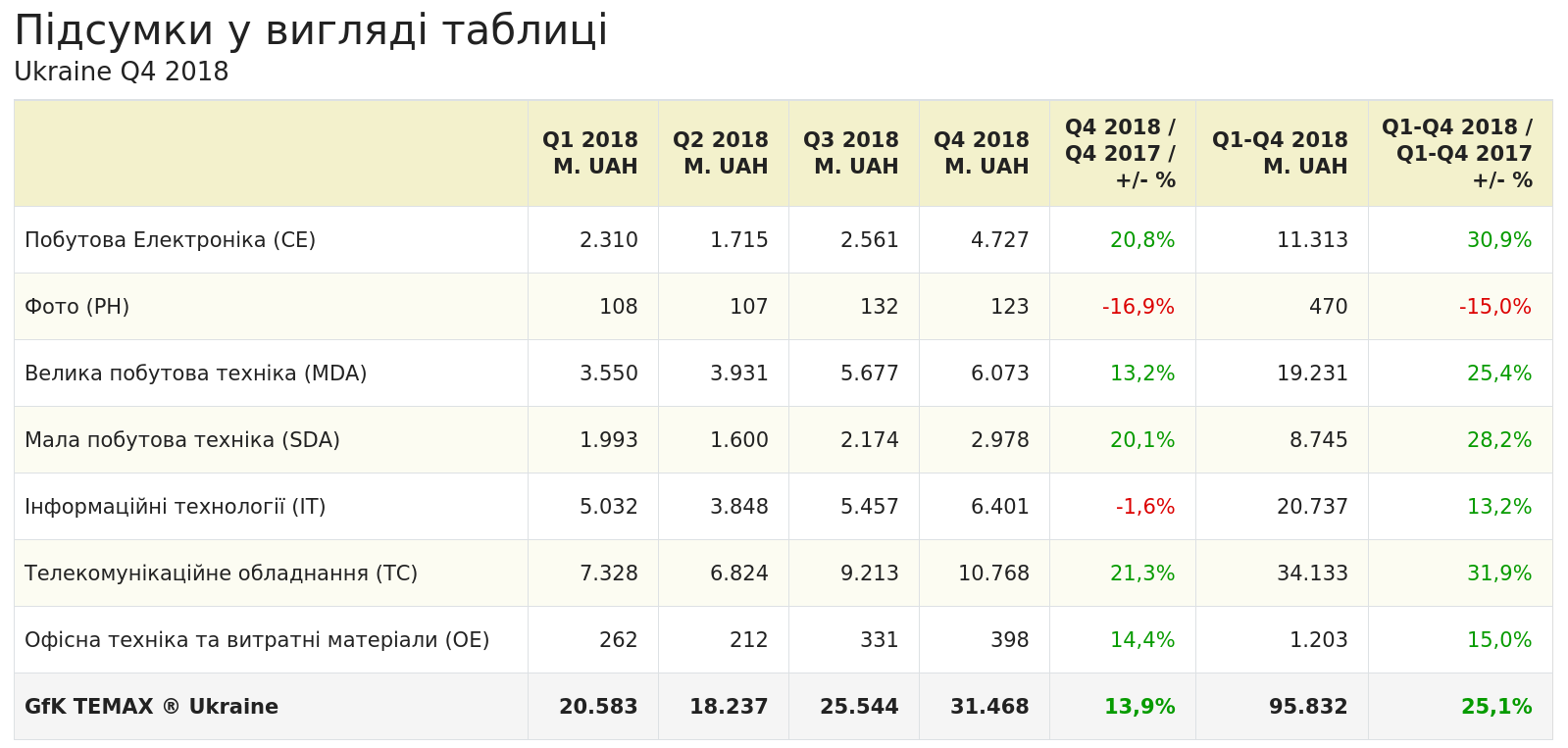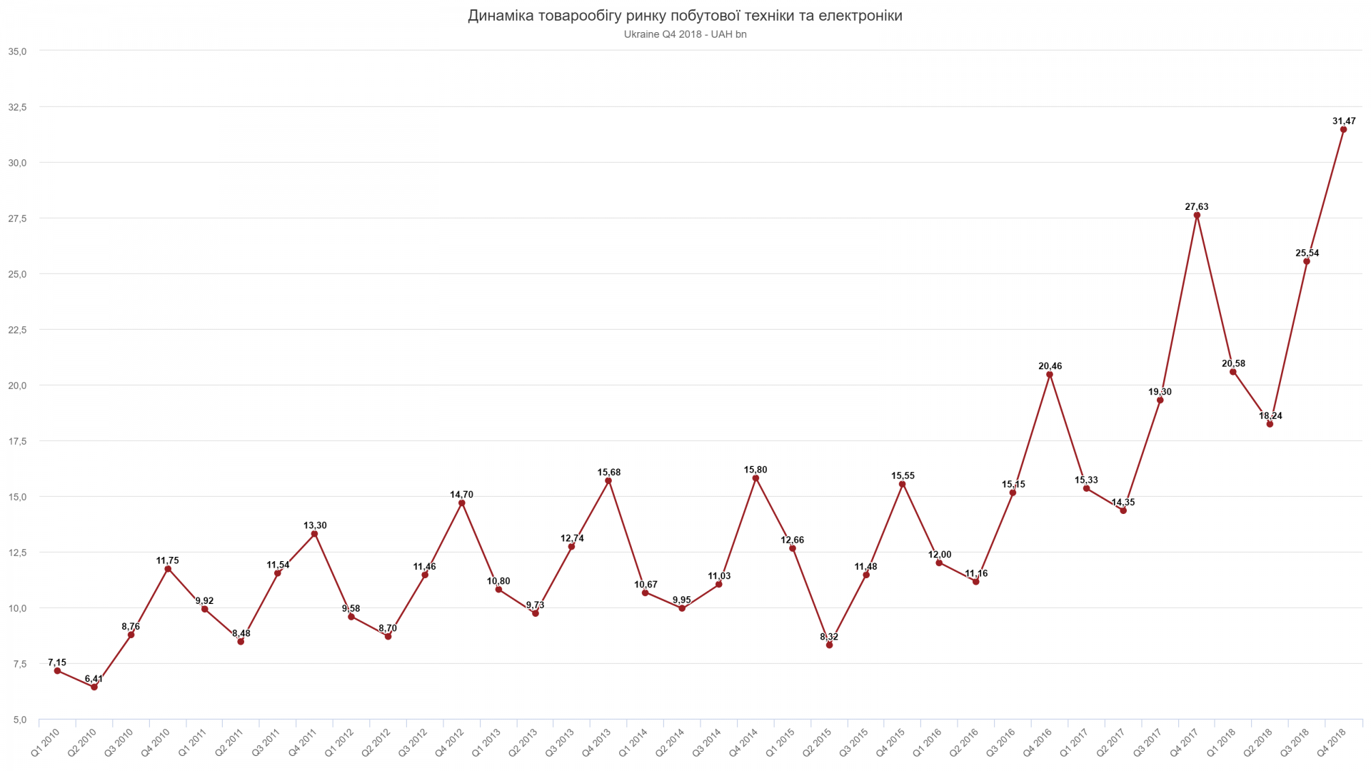 Як свідчать дані дослідження GfK TEMAX Україна, за IV квартал 2018 року загальний обсяг продажів на українському ринку побутової техніки та електроніки склав майже 31,5 млрд грн, збільшившись майже на 14% у порівнянні з аналогічним періодом 2017-го.