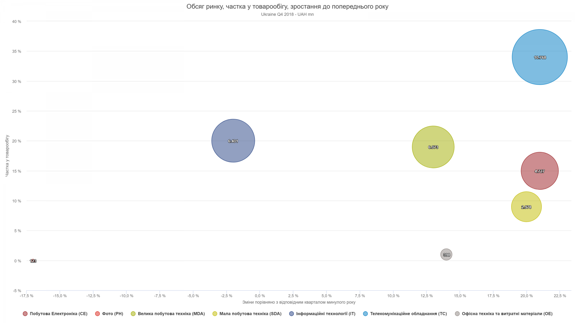 Зазначимо, що в загальному обсязі продажів ринку найбільшу частку в 2018 році зайняли сектори «Телекомунікаційне обладнання» (34,1 млрд грн), «Інформаційні технології» (20,7 млрд грн), та «Велика побутова техніка» (19,2 млрд грн), а найменшу – сегмент «Фото» (470 млн грн), а також «Офісна техніка та витратні матеріали» (1,2 млрд грн). Аналогічні сектори займали найбільшу частку ринку й в IV кварталі 2018-го.
