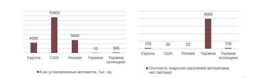 “Україна майже не розвинена в плані вендінгового бізнесу: працює близько 10 000 вендінгових автоматів, переважно в містах-мільйонниках. Відповідно, на один автомат припадає 4000-4500 осіб. Ринок заповнений на 3-5%”, – говорить керівник департаменту фінансового консалтингу Pro Capital Investment Юлія Назаренко.