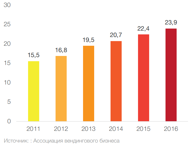 Згідно зі звітом Європейської вендінгової асоціації (EVA) за 2017 рік, в Європі налічується понад чотири мільйони торгових автоматів (один на 190 осіб), оборот яких сягає майже $16 млрд на рік. За рік доходи вендінгових мереж збільшилися на 3,3%, а кількість машин – на 1,6%. Начебто небагато, але в абсолютних цифрах приріст доходу – сотні мільйонів.
