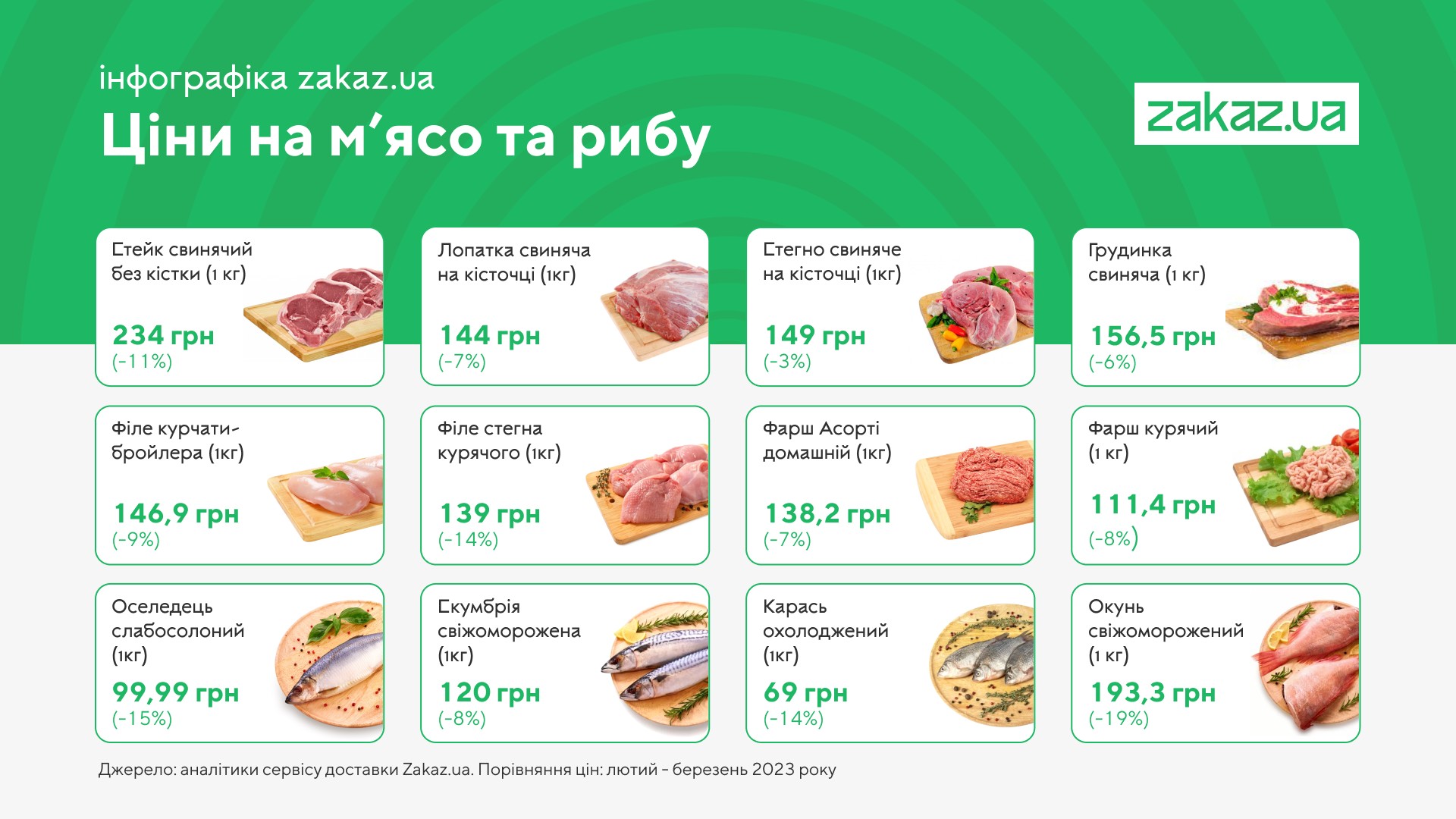 За статистикою Zakaz.ua, найбільшою популярністю серед українців користується курятина, яка зустрічається в кожному третьому кошику онлайн-покупця. Вартість свіжого філе курчати-бройлера в українських супермаркетах у березні відносно лютого зменшилася на 9%, середня ціна становить близько 147 грн за кілограм. Також у березні вигідніше купувати філе курячого стегна та фарш, ціни на ці продукти знизились на 14% та 7% відповідно. Для тих, хто з початком весняних сонячних теплих днів планує відпочити на природі та засмажити шашлик, теж є гарні новини. Ціни на м’ясо свинини у березні помітно знизились. Так, наприклад, свинячий стейк без кістки подешевшав на 11% та вартує в середньому 234 грн/кг. Дешевше коштує лопатка на кісточці – ціна знизилась на 7% (144 грн/кг), стегно – на 3% (149 грн/кг) та грудинка свиняча на 6% (156 грн/кг). Тим часом, середня вартість свіжого сала залишилася на рівні минулого місяця – 189,00 грн/кг. А ось солоне знизилося у ціні з 270,20 грн/кг до 255,30 грн/кг.