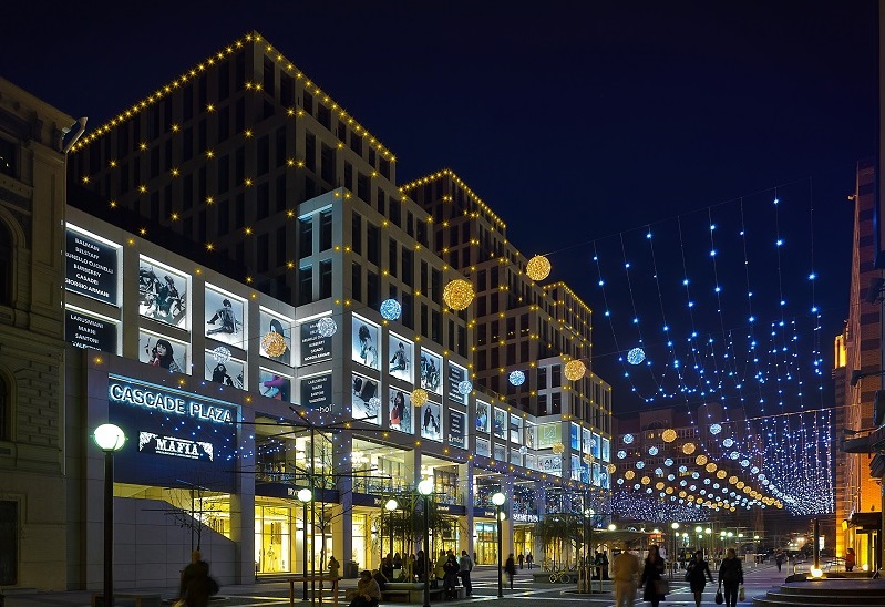 Сам по собі комплекс CASCADE PLAZA, розташований на головній пішохідній площі міста, і з настанням темряви створює яскраве світлове шоу, вже встиг стати одним з головних визначних пам’яток обласного центру.