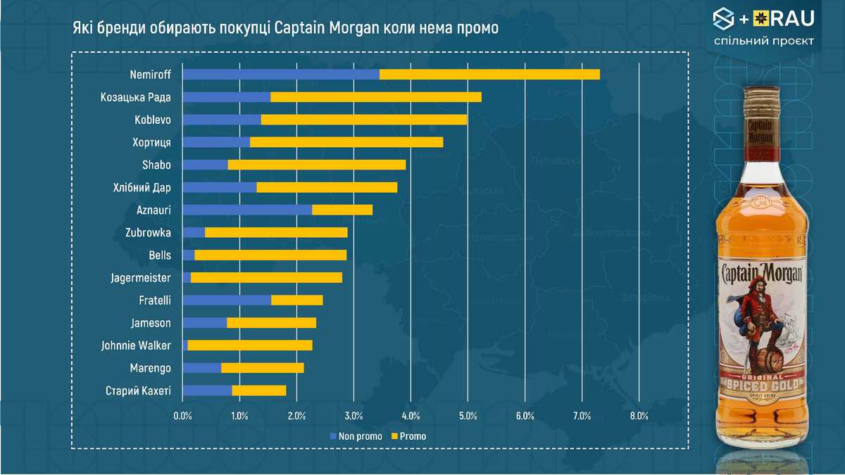 Також цікаво подивитися на вибір споживача, коли він не знаходить промо і на які альтернативні бренди звертає увагу. Наприклад, коли немає акції на ром Captain Morgan, споживачі одразу беруть горілку Nemiroff або Козацька рада.