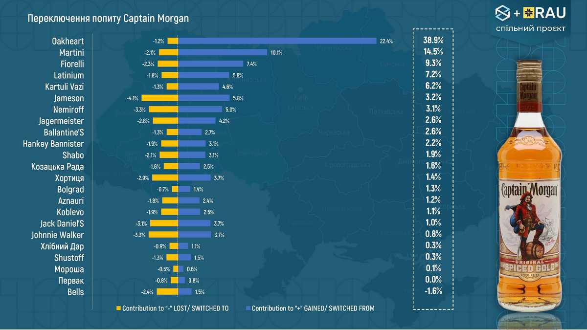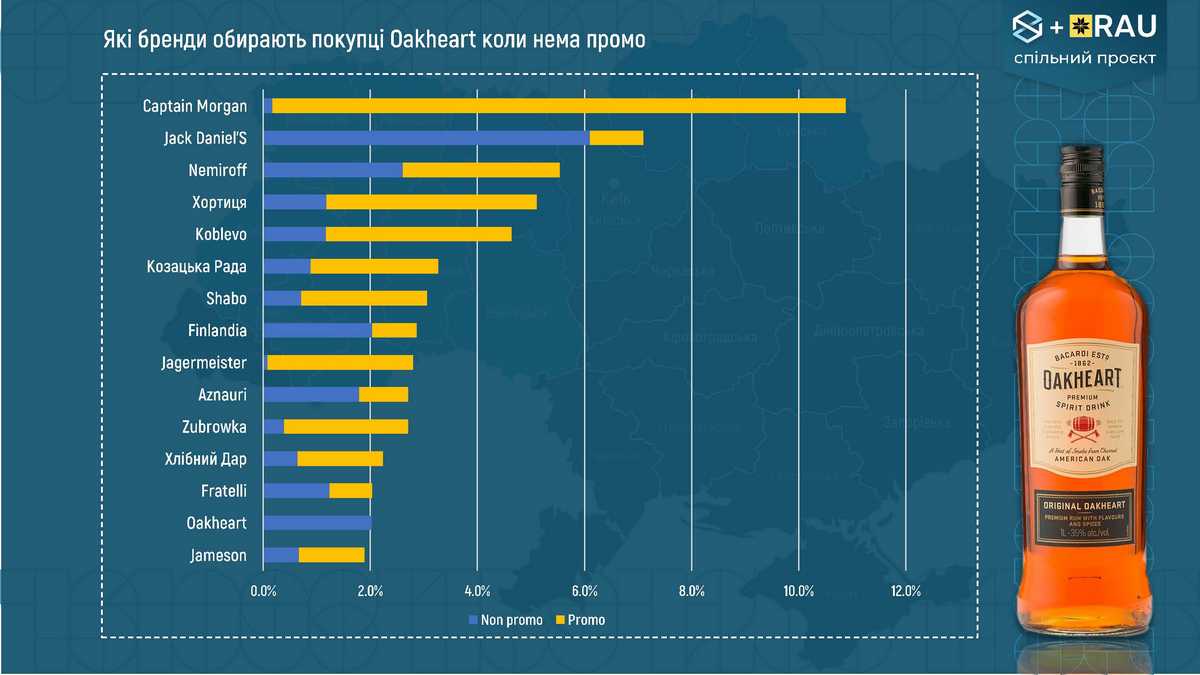 Промо здатне переключати попит з одного бренду на інший. В цьому сенсі показовим є приклад саме Captain Morgan, який «забрав» 22,4% продажів Oakheart, а також частково в інших брендів таких як Martini, Fiorelli, Latinium, Kartuli Vazi та інших. Загалом 38,9%. В самого Captain Morgan зміг відібрати частку в 1,6% тільки Bell’s.