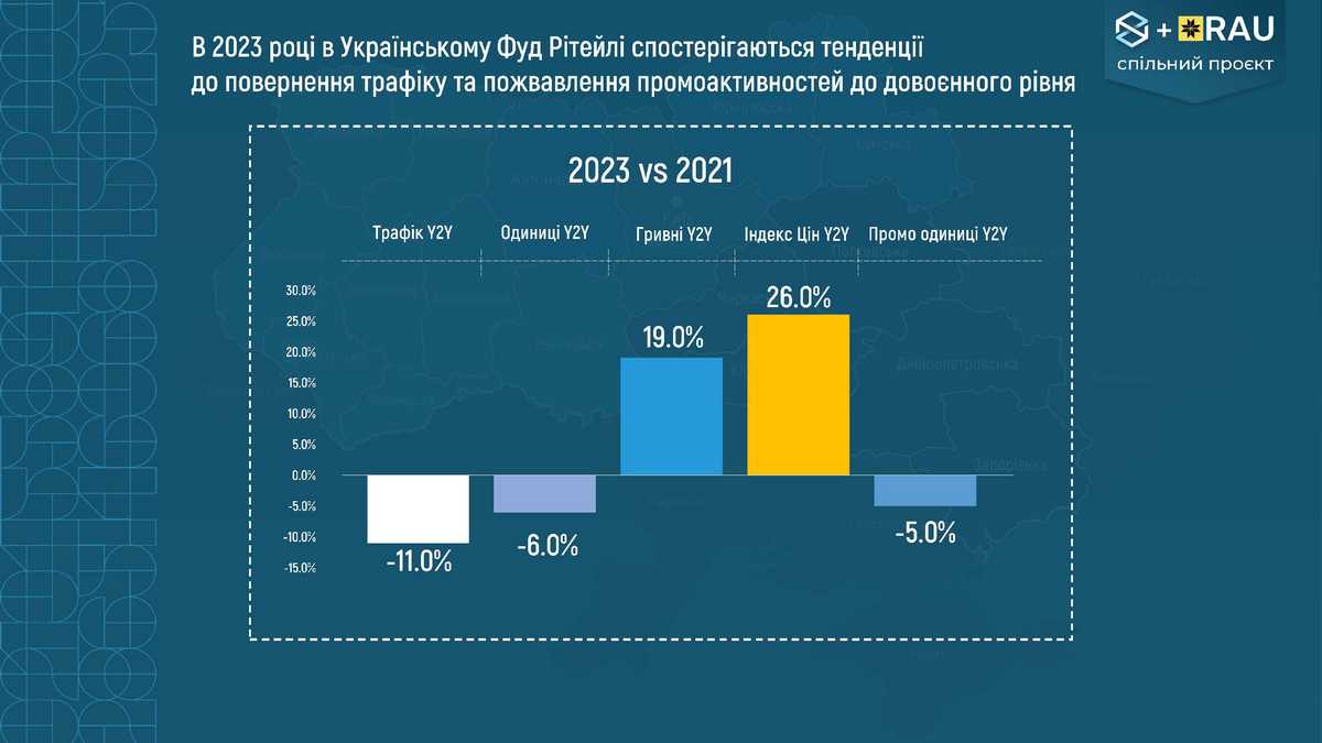 Оскільки частка промо-товарів у кошиках споживачів почала збільшуватися, було цікаво дізнатися: наскільки ці зміни відповідають довоєнним показникам. Було проаналізовано більше 300 млн чеків. Відповідно, порівнюючи загальні показники продажів в Україні за 2023 рік з 2021-м, дослідники з’ясували, що трафік наразі менше на 11%, а кількість одиниць товару в кошику – на 6% менша ніж до війни. Водночас продажі в гривнях більші на 19%, а середня вартість одиниці проданої продукції зросла на 26%. Тому останню цифру можна вважати таким собі умовним показником інфляції. Це середня цифра, оскільки по деяких категоріях, наприклад, овочах та фруктах попередні дослідження фіксували збільшення цінника на 70%.