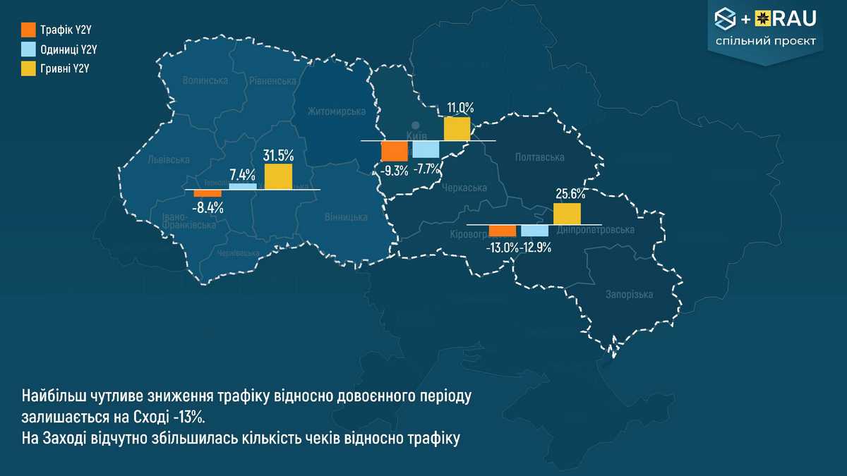Якщо умовно розділити територію України на три великі регіони – схід, захід і окремо Київ – можна побачити, що на заході країни трафік скоротився найменше – на 8%. В столиці цей показник вже трохи більший (-9%), а на сході відбулося найбільш чутливе скорочення трафіку – одразу на 13%. Тобто чітко прослідковується збільшення споживацької активності по мірі просування на захід.