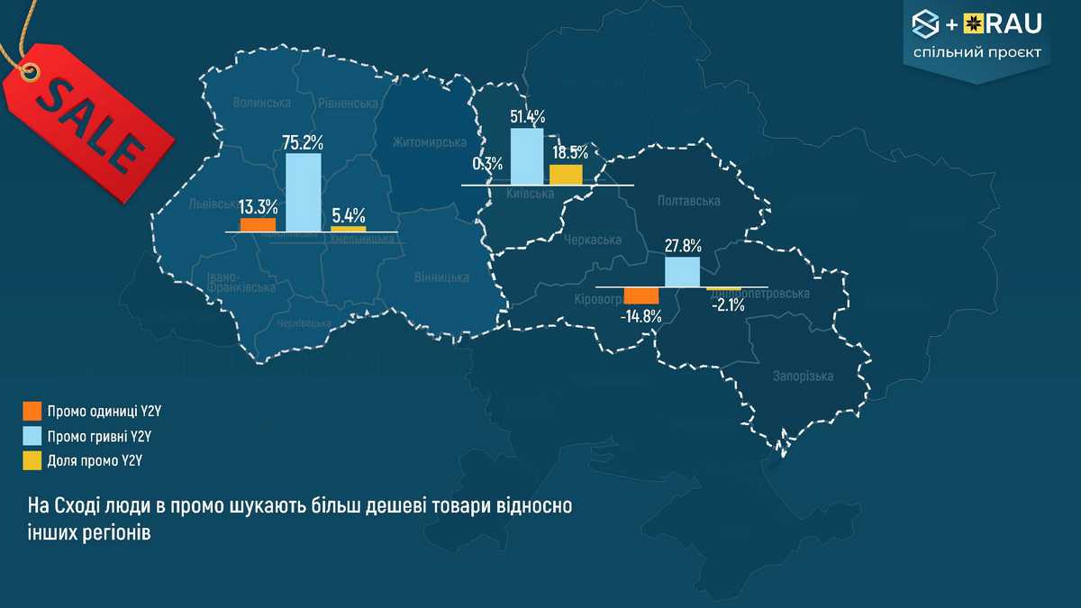 І тільки на сході України промо-одиниці скоротилися на 14,8%. Й хоча у гривні зафіксовано зростання на 27,8%, частка промо впала на 2,1%. Відповідно, порівняно з іншими регіонами тут люди шукають більш дешеві товари навіть серед акційних пропозицій. Варто зазначити, що загалом на сході досить великий відсоток промо фіксувався ще в 2021 році, тому падіння на 2,1% – це нормальний показник, враховуючи досить велику частку промо і до війни.