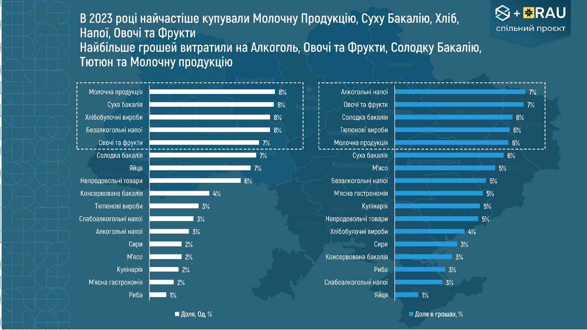 В минулому році найчастіше українці купували молочну продукцію, суху бакалію, хліб, безалкогольні напої, овочі та фрукти. Загалом на ці продукти припадає майже 40% покупок. Найменше українці споживають рибу – всього 1% покупок. А от найбільше грошей витрачають на алкоголь, овочі та фрукти, солодку бакалію, тютюнові вироби та молочну продукцію. На ці топ-5 категорій покупок припадає 42% всіх витрат. Найменше українці витрачають на покупку яєць – 1%.