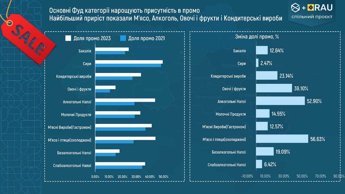 В основних категоріях товарів, таких як бакалія, сир, кондитерські вироби, овочі, фрукти, алкогольні напої, молочні продукти, м’ясо, безалкогольні та слабоалкогольні напої частка промо збільшилася.