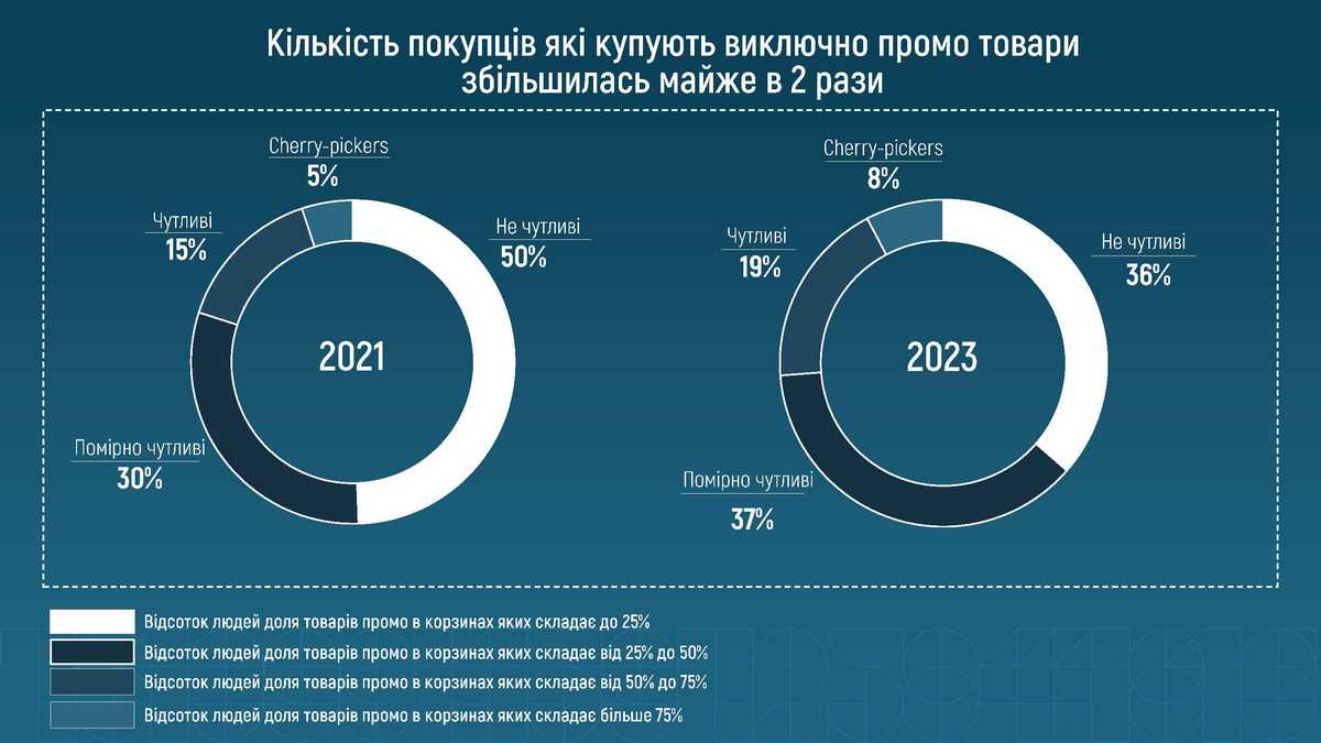 Але вже минулого року картина суттєво змінилася. Кількість покупців, які вибирають лише акційну продукцію (так звані cherry-pickers) збільшилася до 8%, або в 1,6 раза. За рахунок такого перерозподілу кількість тих, хто мав у кошику не більше чверті промо, скоротилася з 50% до 36%. Відповідні зміни сталися і в інших групах. Кількість помірно чутливих до акційних пропозицій покупців тепер вже 37%, і майже п’ята частина тих, у кого в кошику промо займає 50-75%.