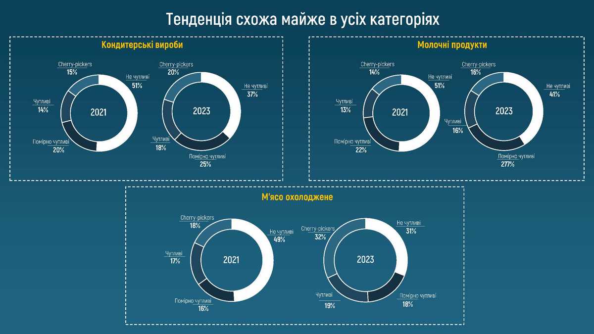 В основних категоріях, таких як кондитерські вироби, м’ясна продукція, молочна продукція і м’ясо так само фіксується збільшення кількості покупців, що шукають акційні товари. Скажімо, при покупці охолодженого м’яса частка тих, хто орієнтується тільки на промо, зросла з 18% до 32%. А не чутливих до акційних пропозицій тепер лише третина, а не 49% як було в 2021 році. Тобто кількість людей, які шукають промо, дуже сильно зростає.
