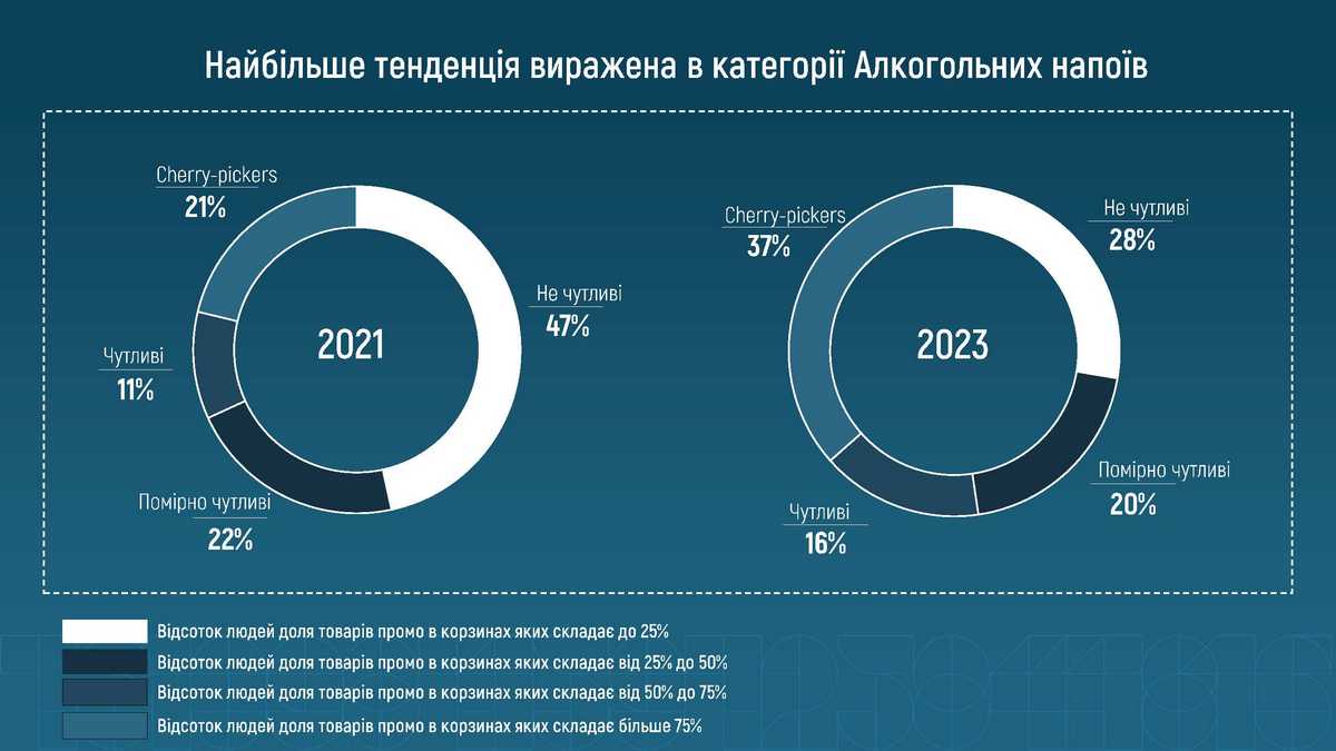 Оскільки алкоголь є досить значною категорією продуктів, з великою часткою промо та найбільшим розміром витрат на його покупку, саме на його прикладі дослідники надали розгорнуту картину споживання.