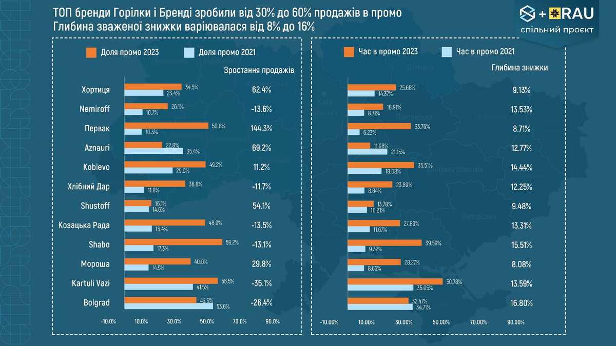 Аби оцінити участь найбільших алкогольних брендів у промо, дослідники розділили напої на дві великі групи, вибравши 24 відомих бренди (по 12 у кожній групі), на базі яких і робили дослідження. В першій групі були горілка та бренді, а в другій – віскі, ром, ігристе і деякі лікери. Практично всі бренди горілки та бренді суттєво наростили свою частку промо відносно 2021 року. Лише бренді Bolgrad в 2023 році трохи зменшив свою частку промо, але в нього і так цей показник був найвищим у 2021 році (53,6%), і зараз цей бренд все ще на рівні з іншими. Водночас деякі бренди серйозно наростили свою долю продажів промо. Наприклад, Первак, Koblevo та Shabo. В результаті всі вони підтягнулися до загальних показників 45-50% частки промо.