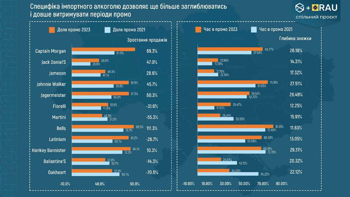 Так само бренд віскі Johnnie Walker наростив частку продажів в промо до 81,5% з 59,8% в 2021 році та 75% часу знаходився в промо. Глибина знижки тут суттєво більша – в середньому 27,5%. Також великий розмір знижки в 26% надавали Captain Morgan та лікер Jagermeister. Мова йде про середній показник для різних ємностей та періодів промо.