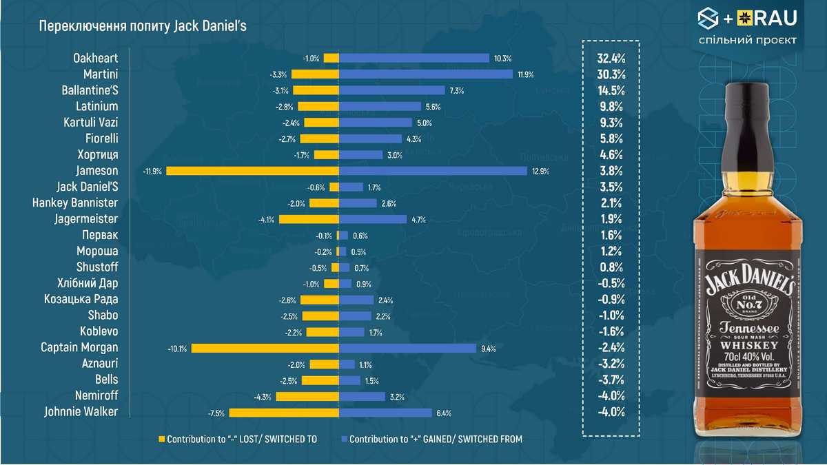 Так само цікаво подивитися на деякі бренди, які не так сильно підпадають під вплив промо та мають свою стабільну аудиторію шанувальників. Наприклад, віскі Jack Daniel’s забрав продажі Oakheart, Martini, Ballantine’s та серйозно змагався в перетягуванні покупців з Jameson. Як бачимо, в цілому Jack Daniel’s виграв, хоча свою частку в промо не збільшував. Тобто бренд має стабільного свого покупця.