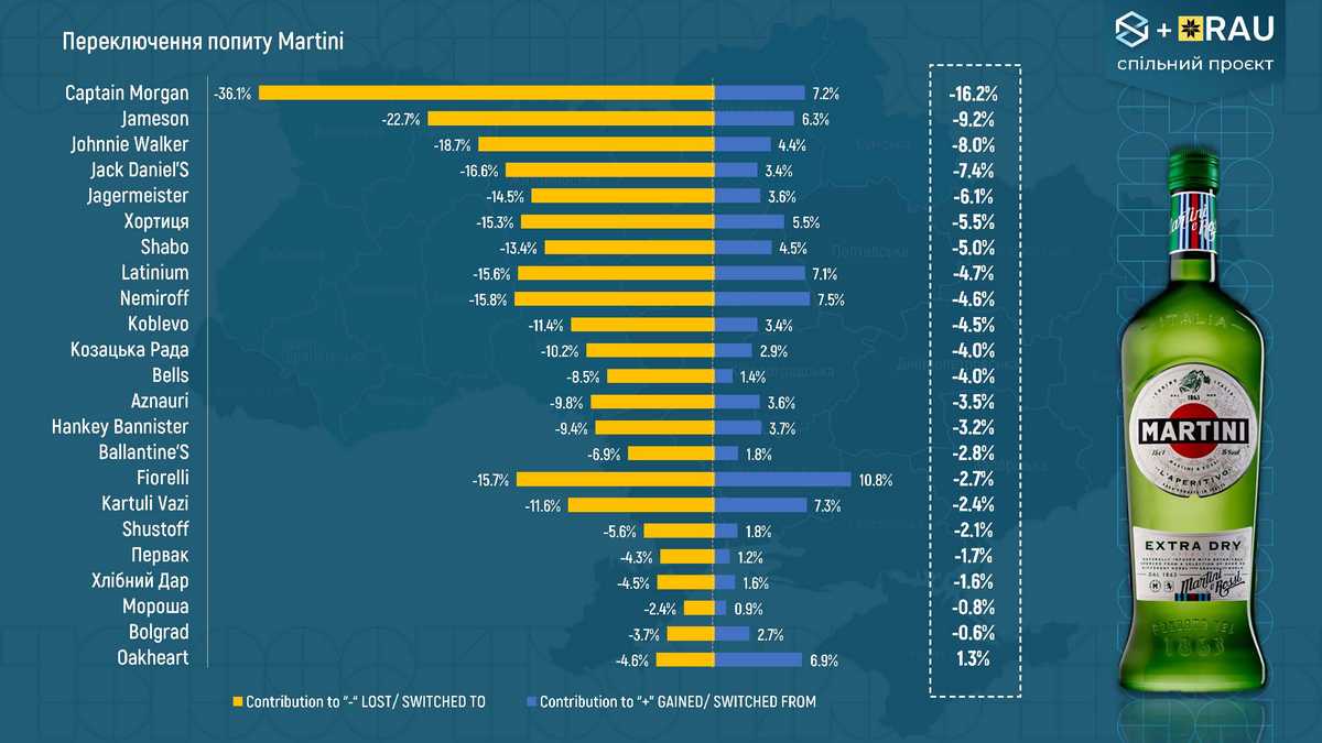 Варта уваги також міграція покупців Martini та Fiorelli – ці бренди втратили частку продажів. Зазвичай такі напої асоціюються з жіночою аудиторією. Виходить так, що з Martini споживачі перейшли на Captain Morgan, Jameson, Johnnie Walker, Jack Daniel’s Jagermeister і горілку Хортиця (але вона лише на шостому місці). Тобто споживачі вибирали позиції, більш міцного дорогого алкоголю, які знаходилися в промо.