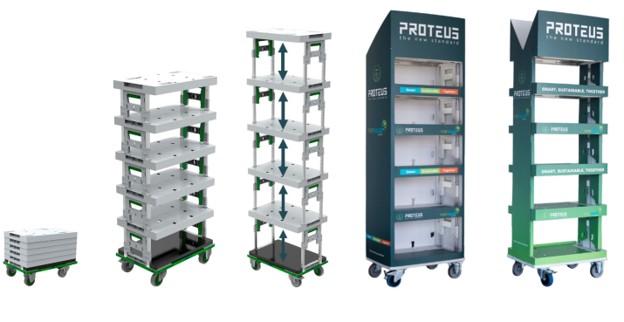 Proteus складається із модульної рами, якій можна задати необхідні розміри та відстань між полицями. Монтаж дисплею доволі простий – полиці висуваються та фіксуються важелями, і, найголовніше, що все це під силу одній людині.