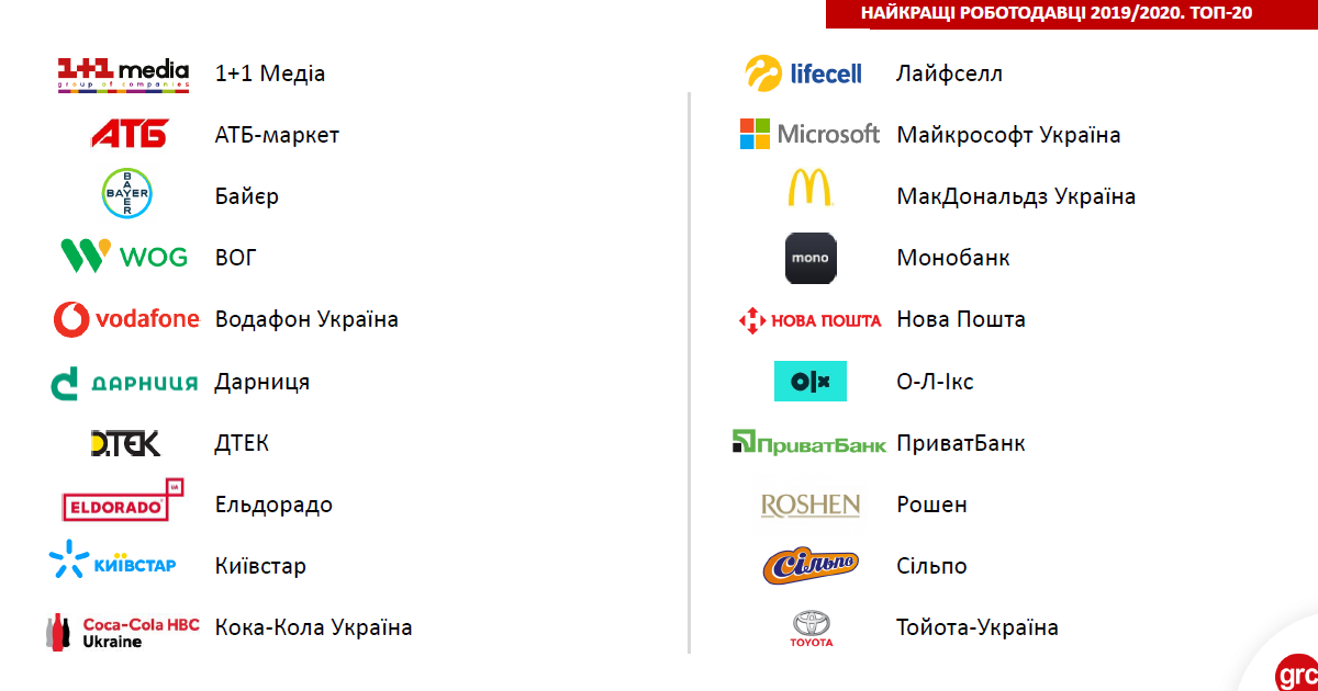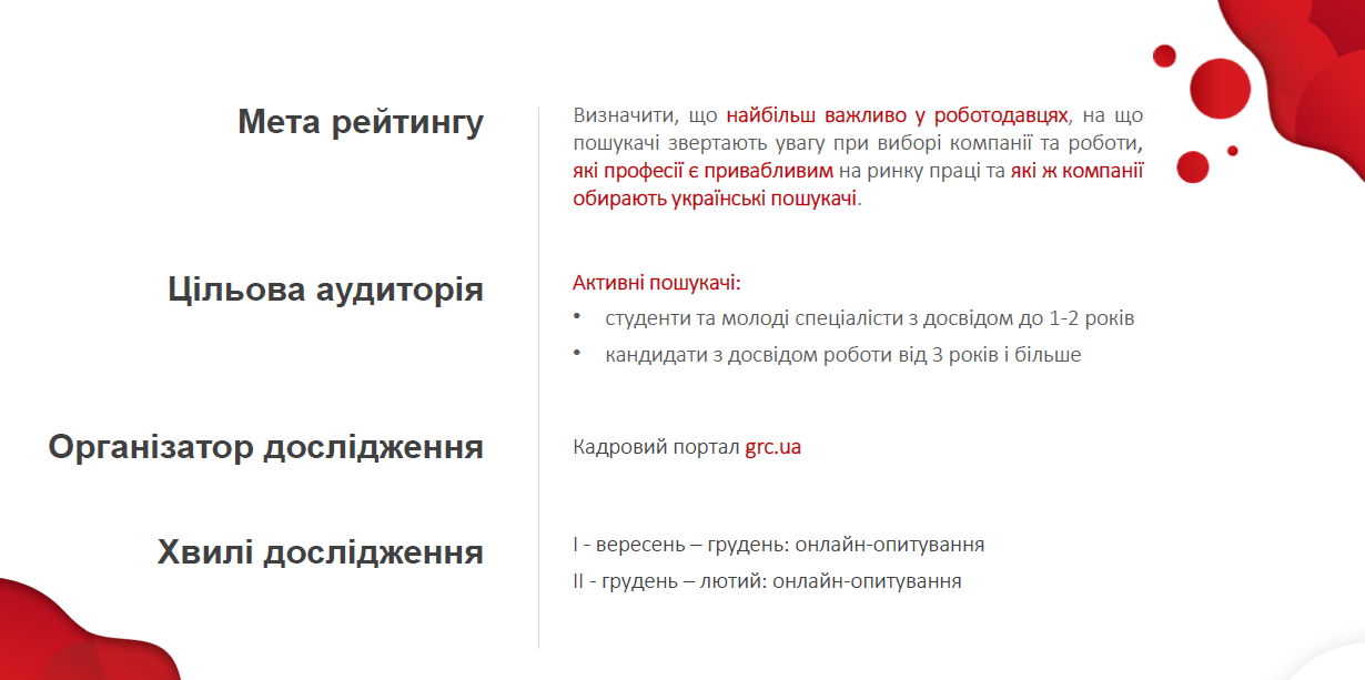 В ході дослідження «Рейтинг роботодавців України», яке проводилося з вересня 2019 року по лютий 2020-го, здобувачі розповідали, якими критеріями керуються при виборі роботи, які галузі вважають привабливими, і в яких компаніях хотіли б працювати. Фахівці рекрутингового порталу grc (раніше HeadHunter Україна, hh.ua) провели анкетування серед 844 і 2631 респондентів (у 1-й і 2-й хвилях відповідно), а також врахували думку експертів ринку праці.