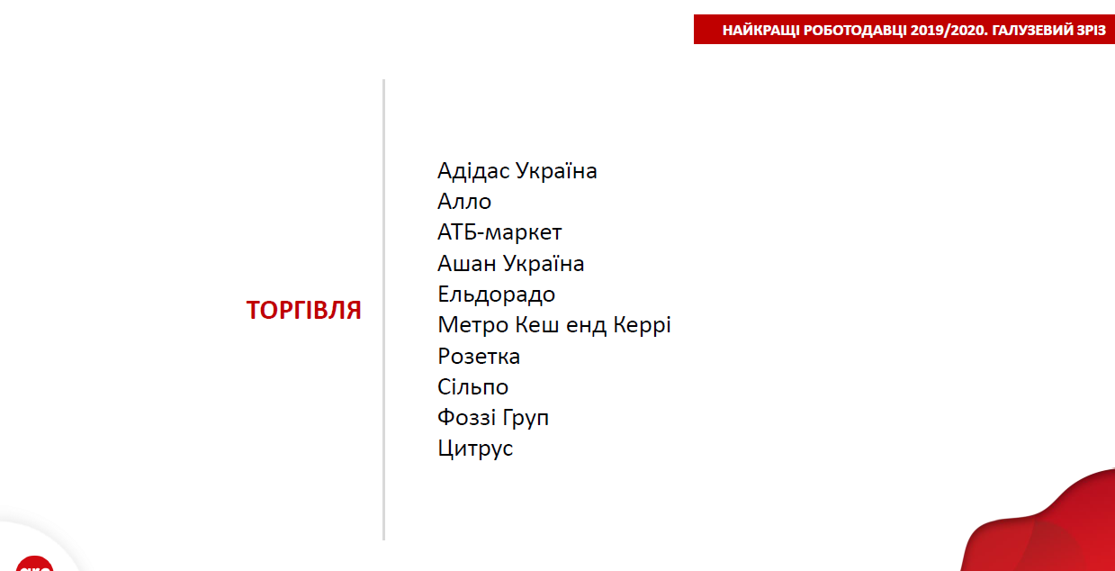 Якщо брати тільки сферу рітейлу, то в десятці кращих компаній України виявилися Adidas Україна, Алло, АТБ-маркет, Ашан Україна, Eldorado, Metro Cash & Carry Україна, Rozetka, Сільпо, Fozzy Group, Цитрус. Як бачимо, половина бажаних для шукачів рітейлерів припадає на FMCG-сектор. Ще чотири доводиться на сферу торгівлі електронікою та побутовою технікою. Причому якщо в FMCG-рітейлі та fashion-індустрії люди хочуть працювати з міжнародними брендами, то в сфері торгівлі гаджетами та технікою панує український роботодавець.