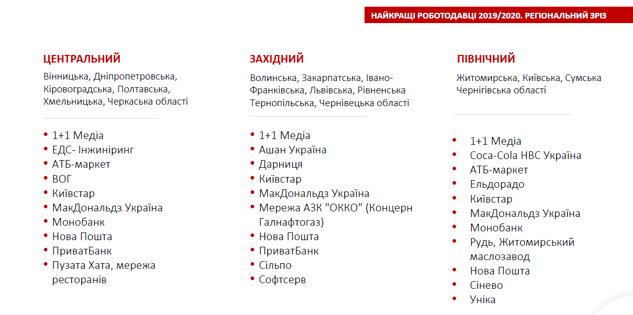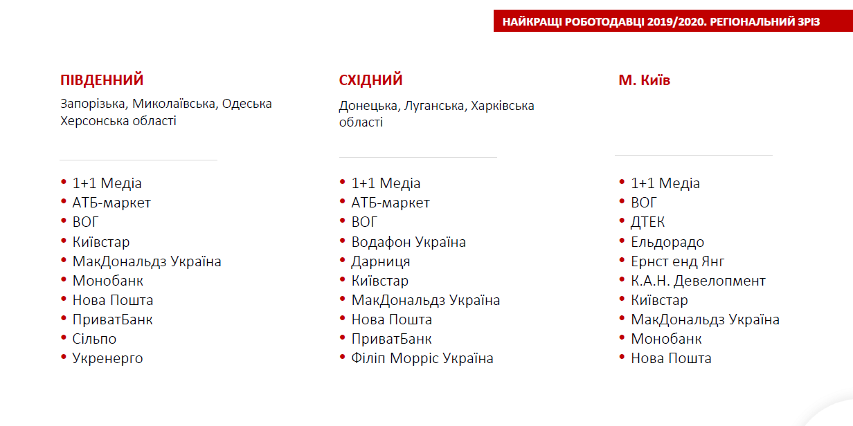 За результатами дослідження сформували загальний топ-20 роботодавців України, а також рейтинги по регіонах і сферах діяльності. Всі списки подані в алфавітному порядку. RAU представляє кращих роботодавців у рітейлі, а повний список можна переглянути за посиланням.