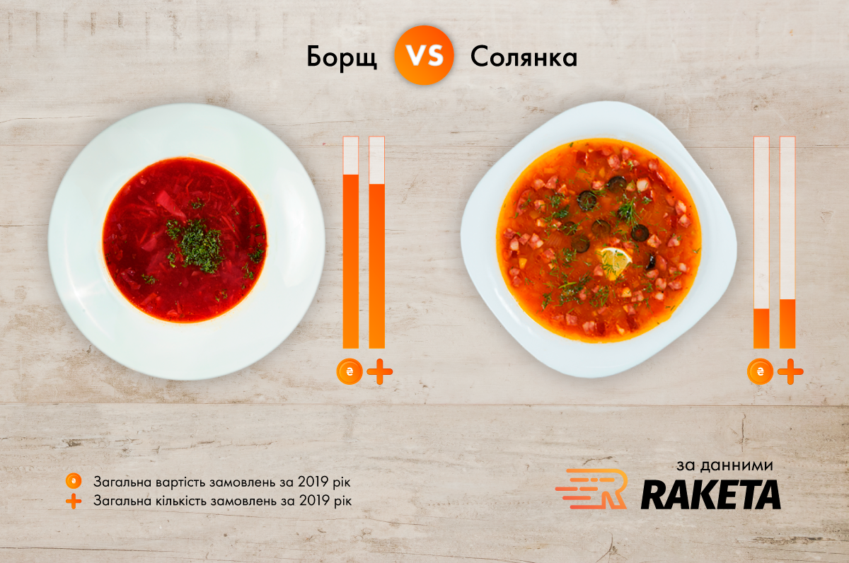 А ось серед перших страв конкурентів борщу немає. Солянка відстає в рази, а вже далі йдуть курячий бульйон, суп місо й інші.