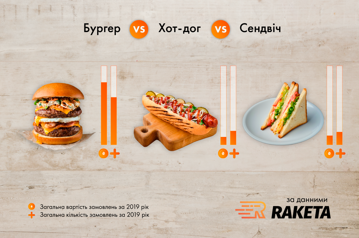 Бургери – безперечний лідер в любові українців до готових бутербродів. Вони в рази популярніші, аніж дешевші хот-доги та сендвічі. Не врятувала останні навіть безкоштовна доставка від сервісу Raketa.