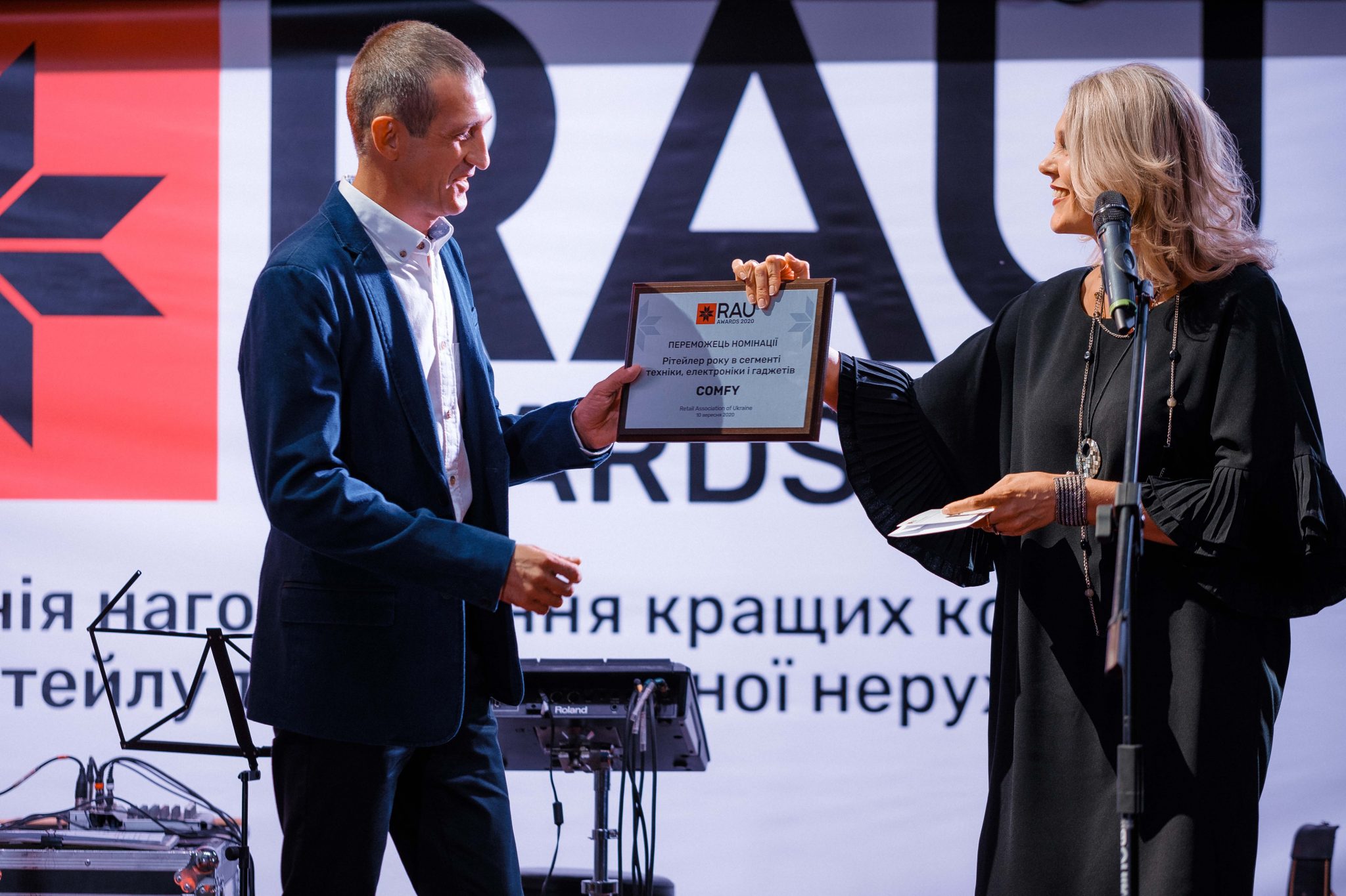Керівник відділу підтримки та розвитку інтернет-магазину Comfy Євген Кисельов отримує нагороду “Рітейлер року в сегменті техніки, електроніки та гаджетів” з рук Наталії Кравець, комерційного директора Dragon Capital Property Management